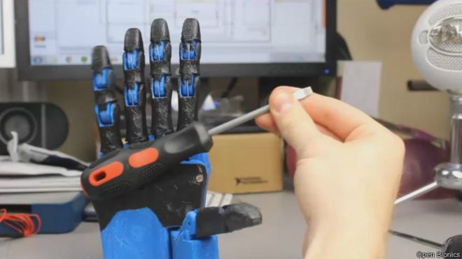 Gibbard, del proyecto Open Bionics, señala que puede escanear a una persona a la que se le ha amputado un brazo usando una impresora 3D y construirle una mano a la medida en menos de dos días.