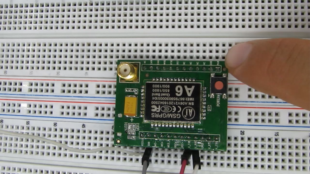Para encender el módulo, podemos hacerlo aplicando un pulso al pin “pwr”(ideal para que lo haga un microcontrolador) o con el botón de power, en forma manual, teniendo apretado durante unos segundos hasta que el led lo empiece a parpadear, y luego quede fijo.