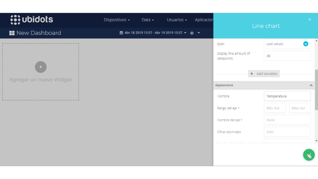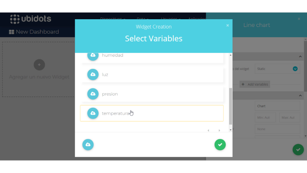 Haremos click en agregar variables, y dentro del dispositivo buscaremos la variable temperatura.
