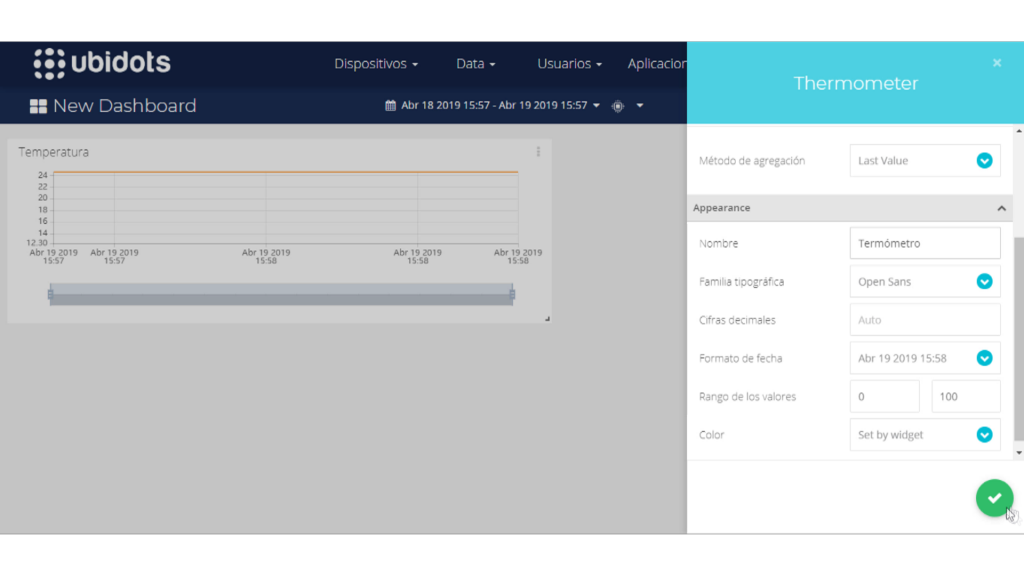 Si queremos podemos agregar otro tipo de widget, del tipo termómetro para la temperatura.
