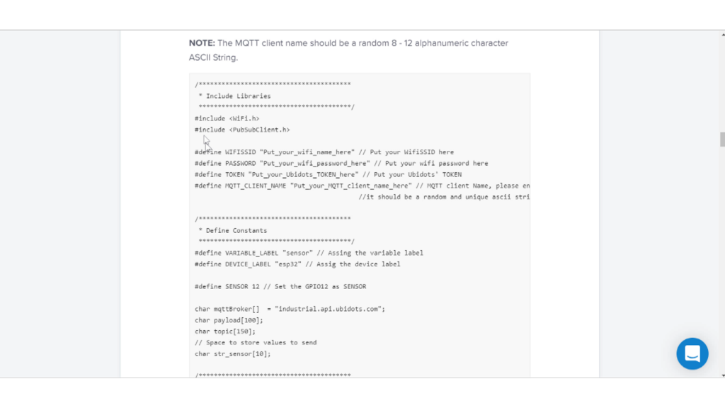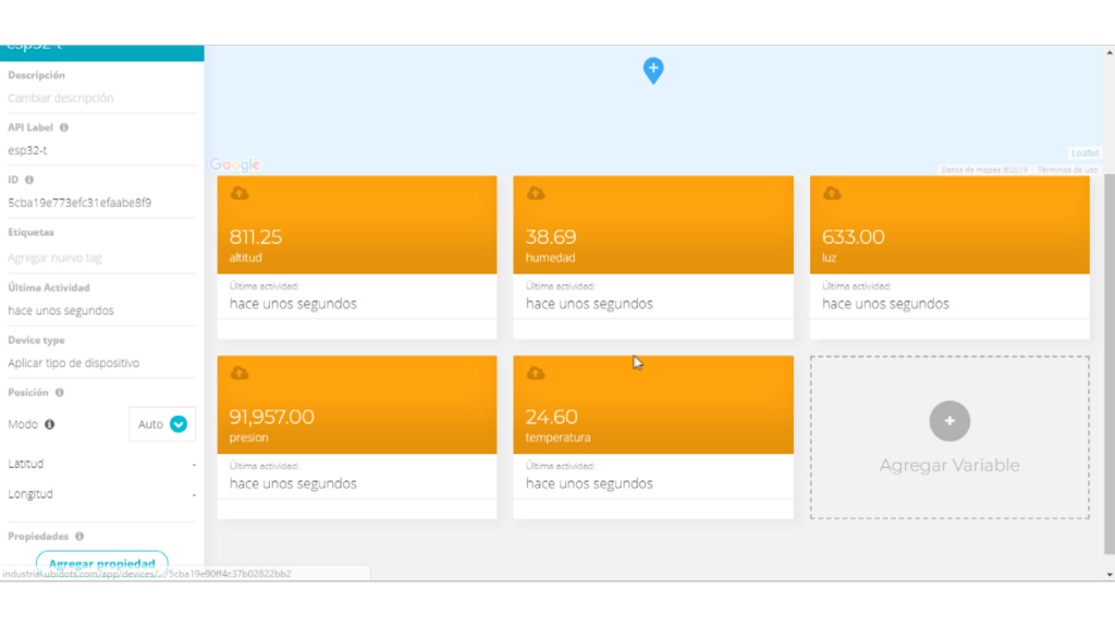 /**************************************** * Incluir librerias ****************************************/ #include <WiFi.h> #include <PubSubClient.h> #include <Wire.h> #include <Adafruit_BMP085.h> #include <BH1750FVI.h> #include "SparkFunHTU21D.h" #define WIFISSID "Mi_red_wifi" // Cambiar por el nombre de tu red wifi #define PASSWORD "Mi_clave_wifi" // Cambia por la contraseña de tu red wifi #define TOKEN "Mi_token_de_ubidots" // Token asignado por Ubidots #define MQTT_CLIENT_NAME "Mi_nombre_MQTT" // Nombre del cliente MQTT, ingrese su propia cadena ASCII de 8 a 12 caracteres alfanuméricos; // debe ser una cadena ascii aleatoria y única y diferente de todos los demás dispositivos Adafruit_BMP085 bmp; // Crea la instancia de Lightsensor. BH1750FVI LightSensor(BH1750FVI::k_DevModeContLowRes); //Crear una instancia del objeto myHumidity HTU21D myHumidity; /**************************************** * Definimos etiquetas ****************************************/ #define VARIABLE_LABEL_1 "temperatura" // Asigna una etiqueta de variable única para enviar los datos de temperatura #define VARIABLE_LABEL_2 "presion" // Asigna una etiqueta de variable única para enviar los datos de la presión atmosférica #define VARIABLE_LABEL_3 "altitud" // Asigna una etiqueta de variable única para enviar los datos de altitud #define VARIABLE_LABEL_4 "luz" // Asigna una etiqueta de variable única para enviar los datos de intensidad de luz #define VARIABLE_LABEL_5 "humedad" // Asigna una etiqueta de variable única para enviar los datos de la humedad #define DEVICE_LABEL "Esp32-T" // Asigna la etiqueta del dispositivo char mqttBroker[] = "industrial.api.ubidots.com"; char dato1[100]; char dato2[100]; char dato3[100]; char dato4[100]; char dato5[100]; char var1[150]; char var2[150]; char var3[150]; char var4[150]; char var5[150]; // Espacio para almacenar valores a enviar. char sensor1[10]; char sensor2[10]; char sensor3[10]; char sensor4[10]; char sensor5[10]; /**************************************** * Funciones auxiliares ****************************************/ WiFiClient ubidots; PubSubClient client(ubidots); void callback(char* var, byte* dato, unsigned int length) { char p[length + 1]; memcpy(p, dato, length); p[length] = NULL; String message(p); } /**************************************** * Funciones principales ****************************************/ void setup() { Serial.begin(115200);//Puerto serial a 115200 WiFi.begin(WIFISSID, PASSWORD);//Inicializamos la red wifi con los datos nuestra red wifi Serial.println(); Serial.print("Esperando conexion WiFi..."); while (WiFi.status() != WL_CONNECTED) { Serial.print("."); delay(500); Serial.println(""); Serial.println("WiFi Connectado"); Serial.println("Direccion: "); Serial.println(WiFi.localIP()); client.setServer(mqttBroker, 1883); client.setCallback(callback); if (!bmp.begin()) { Serial.println("No se pudo encontrar un sensor BMP085 válido, verifique el cableado!"); while (1) {} } LightSensor.begin(); myHumidity.begin(); } } void loop() { if (!client.connected()) { reconectar(); } sprintf(var1, "%s%s", "/v1.6/devices/", DEVICE_LABEL); sprintf(var2, "%s%s", "/v1.6/devices/", DEVICE_LABEL); sprintf(var3, "%s%s", "/v1.6/devices/", DEVICE_LABEL); sprintf(var4, "%s%s", "/v1.6/devices/", DEVICE_LABEL); sprintf(var5, "%s%s", "/v1.6/devices/", DEVICE_LABEL); sprintf(dato1, "%s", ""); // Borra dato1 sprintf(dato2, "%s", ""); // Borra dato2 sprintf(dato3, "%s", ""); // Borra dato3 sprintf(dato4, "%s", ""); // Borra dato4 sprintf(dato5, "%s", ""); // Borra dato5 sprintf(dato1, "{\"%s\":", VARIABLE_LABEL_1); sprintf(dato2, "{\"%s\":", VARIABLE_LABEL_2); sprintf(dato3, "{\"%s\":", VARIABLE_LABEL_3); sprintf(dato4, "{\"%s\":", VARIABLE_LABEL_4); sprintf(dato5, "{\"%s\":", VARIABLE_LABEL_5); /**************************************** * Leemos el valor de cada uno de los sensores y lo asignamos a sus respectivas variables ****************************************/ float temperatura = bmp.readTemperature(); float presion = bmp.readPressure(); float altitud = bmp.readAltitude(); uint16_t lux = LightSensor.GetLightIntensity(); float humedad = myHumidity.readHumidity(); /**************************************** * Imprimimos en el terminal serial los datos obtenidos ****************************************/ Serial.print("Temperatura = "); Serial.print(temperatura); Serial.println(" *C"); Serial.print("Presion = "); Serial.print(presion); Serial.println(" Pa"); Serial.print("Altitud = "); Serial.print(altitud); Serial.println(" metros"); Serial.print("Luz: "); Serial.println(lux); Serial.print("Humedad: "); Serial.print(humedad, 1); Serial.println("%"); /* 4 es el ancho mínimo, 2 es la precisión; el valor flotante se copia en las variables sensor*/ dtostrf(temperatura, 4, 2, sensor1); dtostrf(presion, 4, 2, sensor2); dtostrf(altitud, 4, 2, sensor3); dtostrf(lux, 4, 2, sensor4); dtostrf(humedad, 4, 2, sensor5); sprintf(dato1, "%s {\"value\": %s}}", dato1, sensor1); // Agrega el valor sprintf(dato2, "%s {\"value\": %s}}", dato2, sensor2); // Agrega el valor sprintf(dato3, "%s {\"value\": %s}}", dato3, sensor3); // Agrega el valor sprintf(dato4, "%s {\"value\": %s}}", dato4, sensor4); // Agrega el valor sprintf(dato5, "%s {\"value\": %s}}", dato5, sensor5); // Agrega el valor Serial.println("Publicación de datos en nube de Ubidots"); /**************************************** * Publicamos los datos en los servidores de ubidots ****************************************/ client.publish(var1, dato1); client.publish(var2, dato2); client.publish(var3, dato3); client.publish(var4, dato4); client.publish(var5, dato5); client.loop(); delay(1000); } /**************************************** * Función reconectar ****************************************/ void reconectar() { // Bucle hasta que nos reconectemos while (!client.connected()) { Serial.println("Intentando la conexión MQTT..."); // Attemp to connect if (client.connect(MQTT_CLIENT_NAME, TOKEN, "")) { Serial.println("Connec