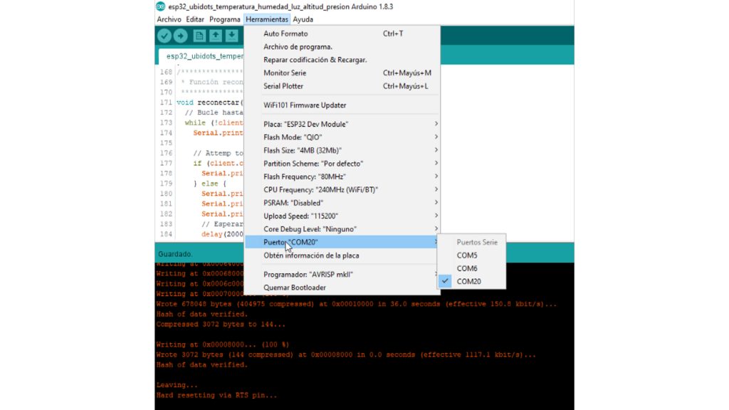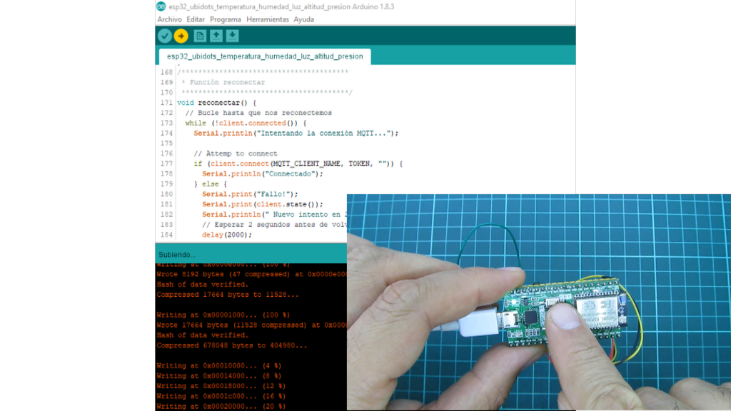 A continuación subimos el código. Recordemos apretar la tecla “key” en el ESP32, si no, nos dará un error.