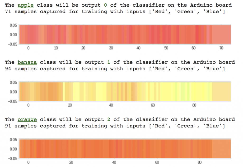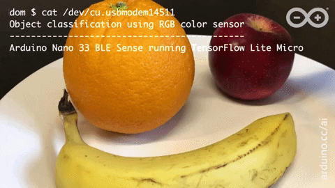 En este tutorial, cuando el objeto está lo suficientemente cerca, tomamos muestras del color: el sensor RGB incorporado se puede ver como una cámara de color de 1 píxel. Si bien este método tiene limitaciones, nos proporciona una forma rápida de clasificar objetos solo con una pequeña cantidad de recursos. Tenga en cuenta que podría ejecutar un modelo de visión completo basado en CNN en el dispositivo. Como esta placa Arduino en particular incluye un colorímetro a bordo, pensamos que sería divertido e instructivo comenzar de esta manera.