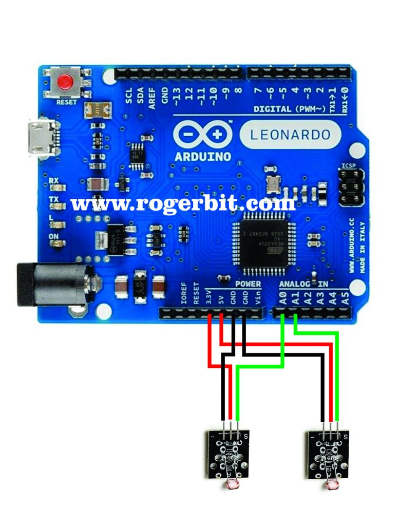 Este módulo consta de una fotorresistencia y una resistencia en línea de 10   . La resistencia del fotorresistor disminuirá en presencia de luz y aumentará en ausencia de ella. La salida es analógica y determina la intensidad de la luz.